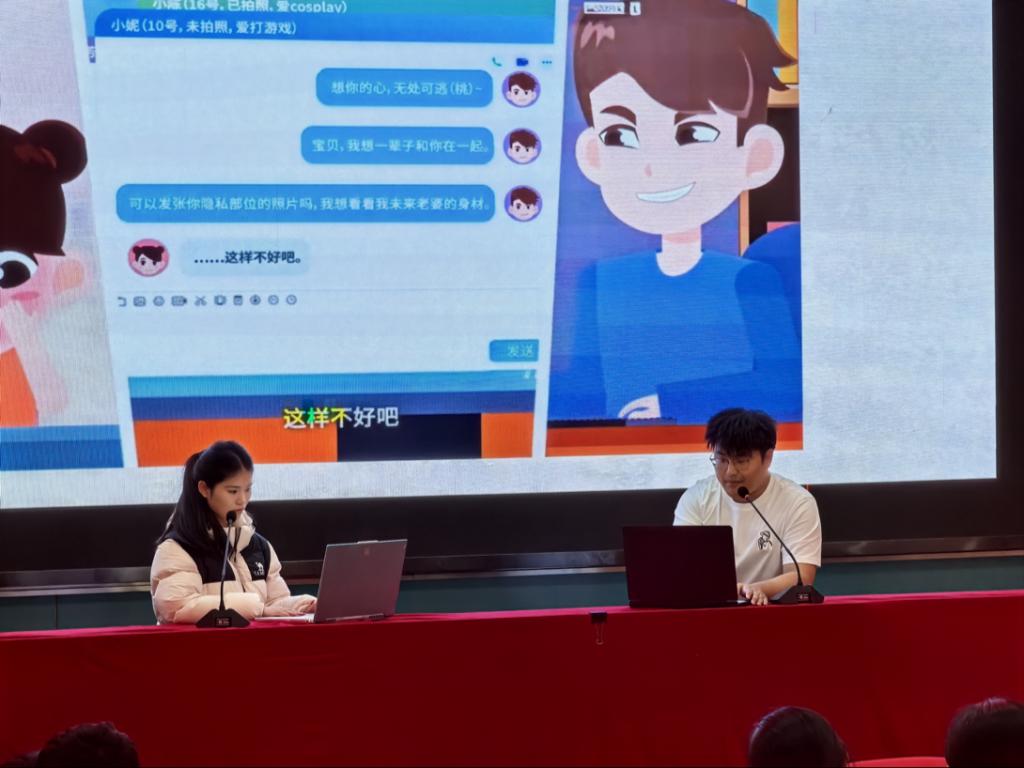 活动进程中,普法志愿者再次打破传统“单向灌输”的模式,采用“双向传递”的模式,创新性推出“趣味问答”“情景演绎”的宣讲方式,让法治宣讲更加生动有效。普法志愿者将目光聚焦于网络平台中良莠不齐的各种信息,以“同龄人”的身份向未完全形成评判是非曲直能力的中小学生传递正确的价值观念。如志愿者讲述cosplay进入大众视野后引发的违法行为,以案释法,帮助孩子们树立正确的法治观念;以真实情景重现,用趣味的短剧向学生们展现存在于网络世界里的隐藏危害—“隔空猥亵”,让学生身临其境助力学生形成正确的评判标准。普法团队正在创新性地把抽象的法条在趣味中变得生动易懂,让学生们真正地做到学法,用法,守法,让他们在法律这颗大树的保护之下茁壮成长。