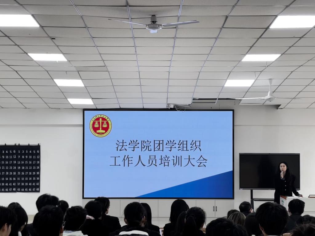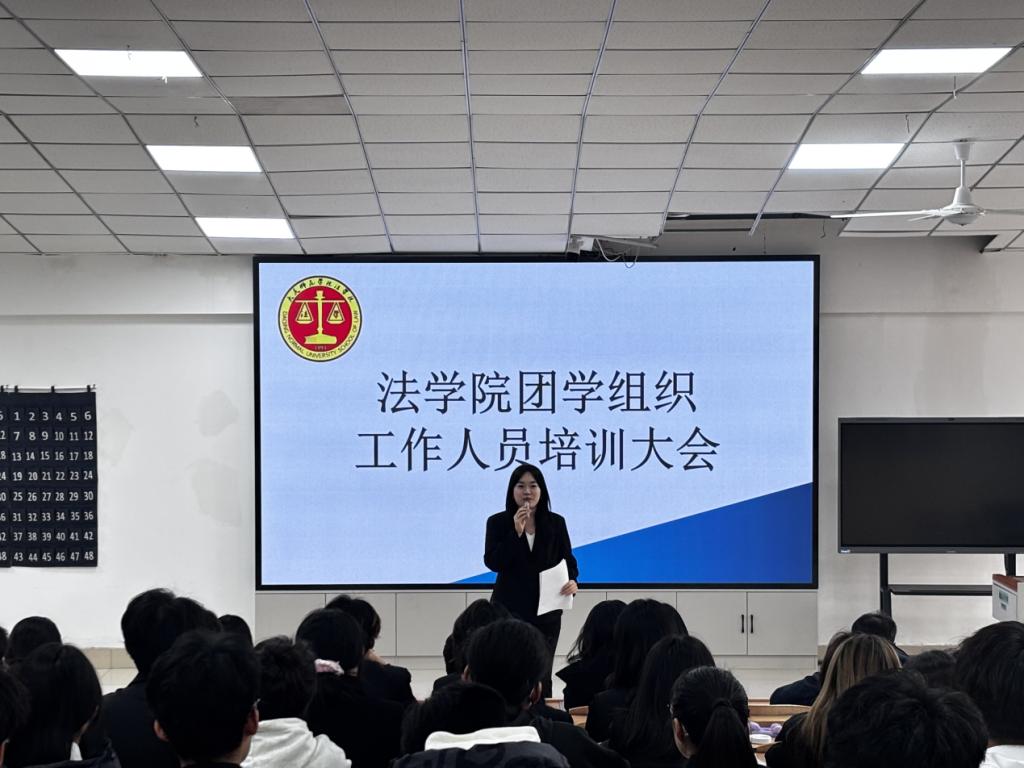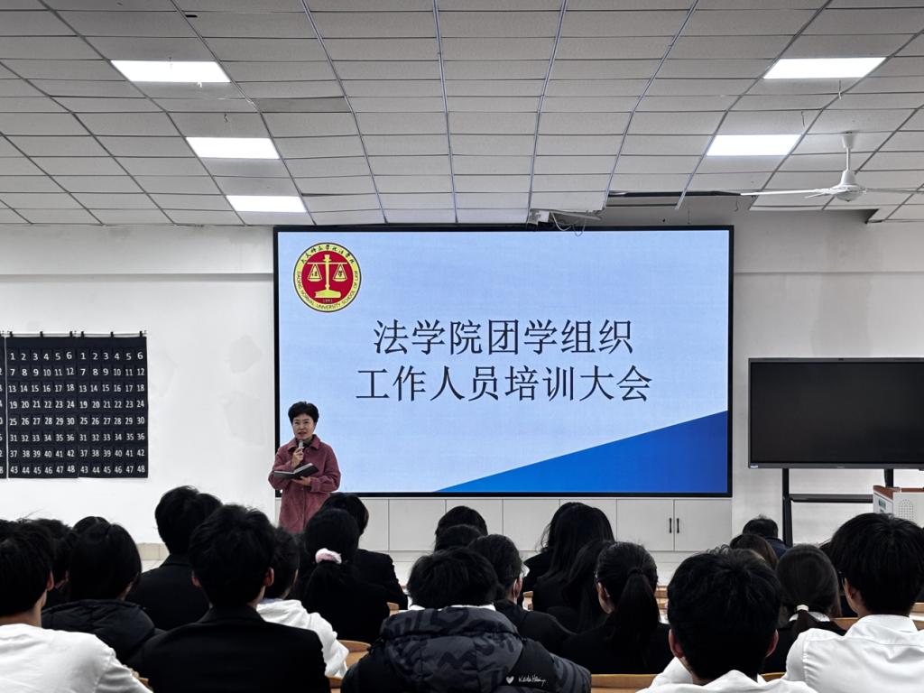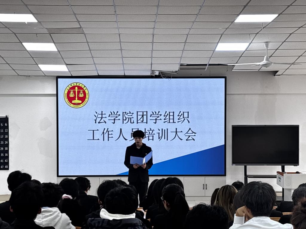 为进一步加强我院团学组织队伍建设,提升学生工作人员的综合素质与业务能力,法学院于10月29日中午在主楼4-2教室召开了团学组织工作人员培训大会。团委书记杨郁婷老师,学工办副主任张彪老师、辅导员关陟平老师、辅导员陶雨朝老师与法学院第二十二届团学组织全体成员出席本次大会。本次大会旨在统一思想、明确职责、规范流程,为新学期团学工作的顺利开展奠定坚实的基础。