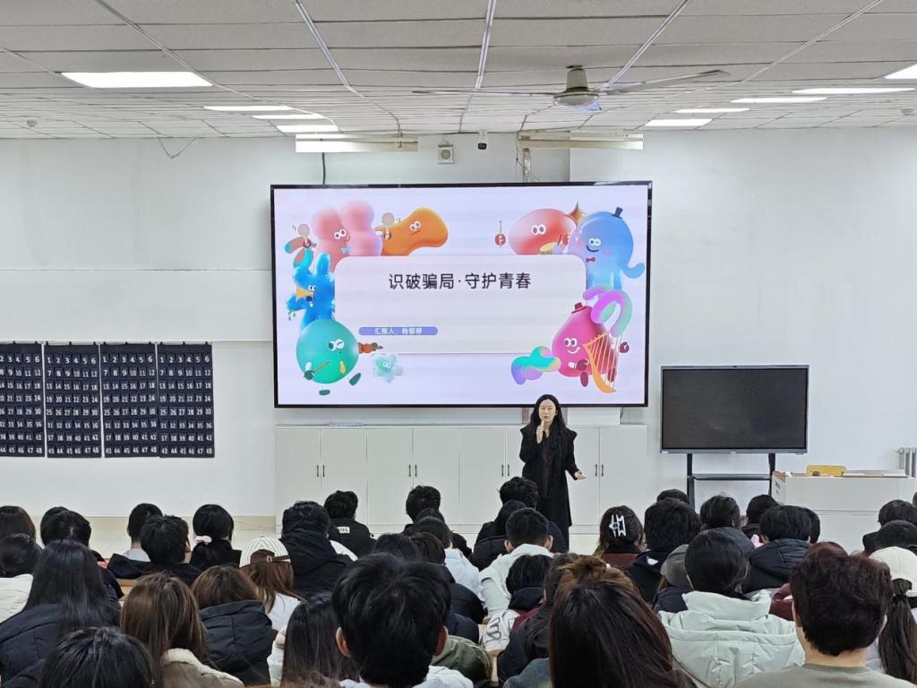 杨郁婷老师首先强调了在当前形势下,普及防电信诈骗知识、提升个人反诈意识的极端必要性与紧迫性,提醒全体同学必须时刻保持警惕,将安全谨记于心。随后,她结合高校高发案例,为同学们系统梳理并普及了多种常见诈骗类型,详细剖析了“刷单返利”、“冒充客服”、“校园贷”、“虚假购物”、“冒充公检法”、“网络交友”及“游戏装备交易”等骗局的作案手法与识别要点。最后,她叮嘱同学们在日常生活中务必提高辨别能力,不轻信、不转账、不泄露个人信息,牢牢守住自己的“钱袋子”。