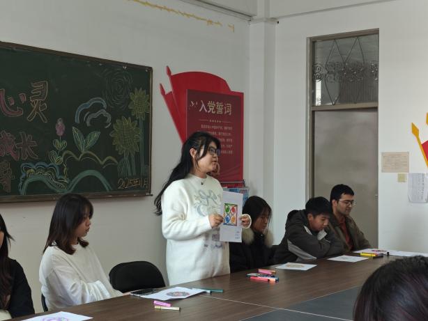 分享环节中,大家踊跃介绍作品的色彩选择与命名含义:有同学以凤凰为原型创作《涅槃》,寓意在成长中完成蜕变;有同学从形状联想时钟绘就《时盘》,映射对时间管理的内在思考;有同学以热烈红橙与梦幻紫色勾勒《我》,借色彩碰撞呈现自我人格的多元维度;更有同学以粉调《秘密花园》为名,在圆形画幅中构建专属心灵空间,诠释曼陀罗“容器与守护”的疗愈内核。每一幅作品的色彩选择、构图逻辑都承载着创作者的潜意识表达,而互动分享让个体心灵与他人产生深度共鸣,实现了曼陀罗团体辅导“自我探索 +人际支持”的双目标。