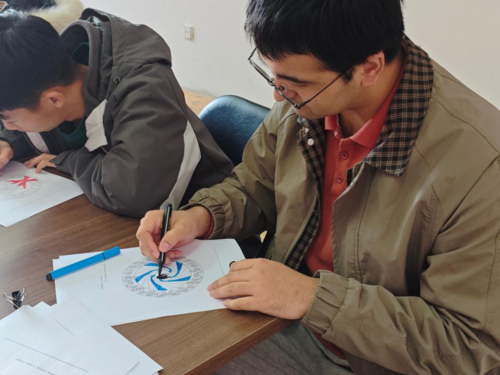 活动破冰环节,关老师引导同学们依次介绍班级与姓名,并用“颜色”为喻描绘当下心情,快速构建起信任联结。随后,在舒缓的音乐中,同学们通过呼吸吐纳放松身心,自主挑选彩色笔开启创作。在曼陀罗特有的圆形框架里,大家将学业焦虑、人际困惑等抽象情绪,转化为具象的色彩搭配与线条布局,借助曼陀罗“整合潜意识、梳理内在秩序”的专业特性,完成了自我情绪的觉察与外化,为积压的情绪找到了健康出口。