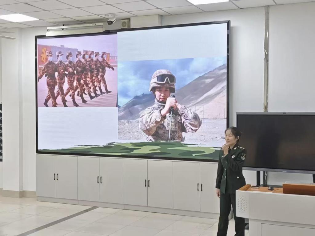 随后,2024级退役大学生士兵赵嫒嫒身着陆军常服亮相,分享了作为陆军边疆卫生员、基层心理骨干、连队文艺骨干的切身感悟,从“入伍缘起”“军旅蜕变”“初心坚守”三个维度,生动讲述了五年边疆服役的难忘经历。她感慨道:“严寒缺氧环境下的巡逻、训练、潜伏,是磨炼意志的‘试金石’;反复打磨的包扎技能,是守护战友生命的‘硬本领’;训练场中组织开展的团体心理训练,是凝聚队伍士气的‘暖心剂’。”部队不仅教会她保家卫国的过硬本领,更培育了她直面困境的勇气、集体协作的智慧与坚守初心的定力。从手握钢枪守护边防,到捧起法条求索法治,赵嫒嫒向学弟学妹们发出号召:“青春无惧迷茫,敢拼敢闯方显本色,愿大家勇担时代使命,让青春在奉献中绽放绚丽光彩。”