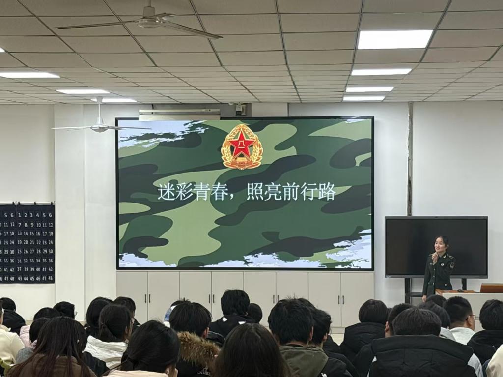分享尾声,团委书记杨郁婷以"青春向党、强军有我"为主题开展思想引领。她肯定了两位退役学子在军营与校园中的担当作为,鼓励全体同学以榜样为镜,传承军人坚毅执着、勇担使命的优良品格,将个人理想与国防建设、法治事业紧密结合,既要争做尊法、学法、守法、用法的法治践行者,更要勇当心系家国、参军报国的追光者,以青春之力践行"请党放心、强国有我"的青春誓言。