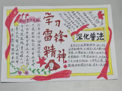 为大力弘扬雷锋精神,深化普法志愿服务,引导青年学子以实际行动参与法治宣传,近日,法学院围绕“弘扬雷锋精神 争做普法先锋”主题,开展普法手抄报志愿活动。