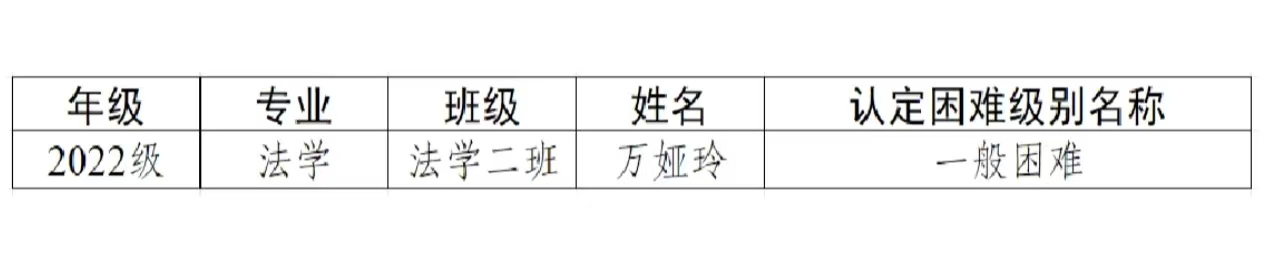 根据《教育部等六部门关于做好家庭经济困难学生认定工作的指导意见》(教财〔2018〕16号)、《黑龙江省家庭经济困难学生认定办法》(黑教规〔2019〕9号)关于“家庭经济困难学生认定工作每学期要按照家庭经济困难学生实际情况进行动态调整”要求及《大庆师范学院家庭经济困难学生认定办法》(庆师发〔2023〕30号)文件,本着公平、公正、合理、精准的原则,经个人申请、资格审查、班级民主评议、年级认定工作小组认定、学院党政联席会议审定。我院2025-2026年春季学期共有1名学生申请认定为家庭经济困难学生,现将名单予以公示。