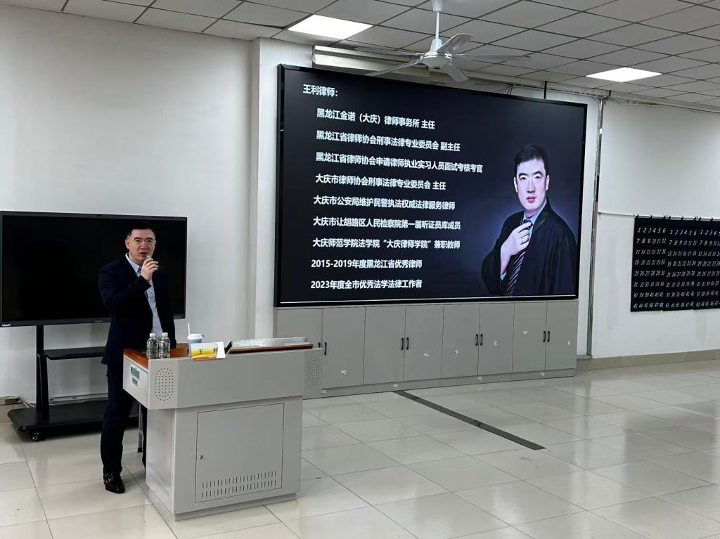 为深化法学专业实践教学、提升学生法律实务能力,4月15日法学院特邀黑龙江金诺(大庆)律师事务所主任、省律协刑委会副主任王利律师,在主楼2-2教室开展“刑事辩护的思路与方法——基于典型案例的深度解析”专题讲座,法学院副院长杨庆玲主持讲座,2023级和2024级法学专业学生到场聆听,现场学习氛围浓厚。