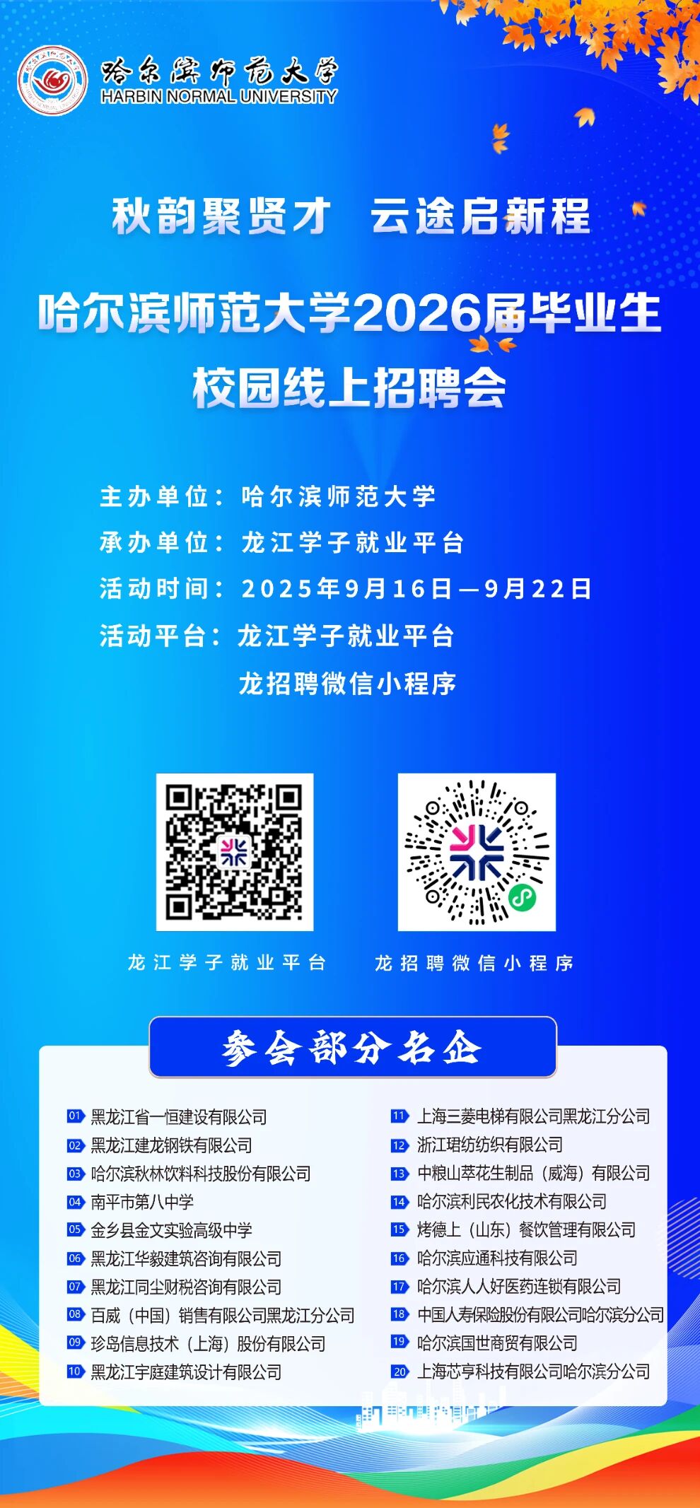 【哈尔滨师范大学】“秋韵聚贤才 云途启新程”哈尔滨师范大学2026届毕业生校园线上招聘会正式启动!