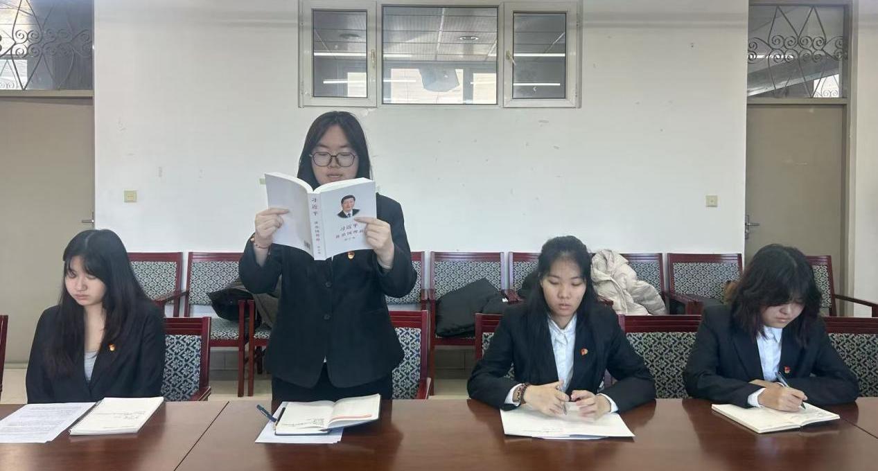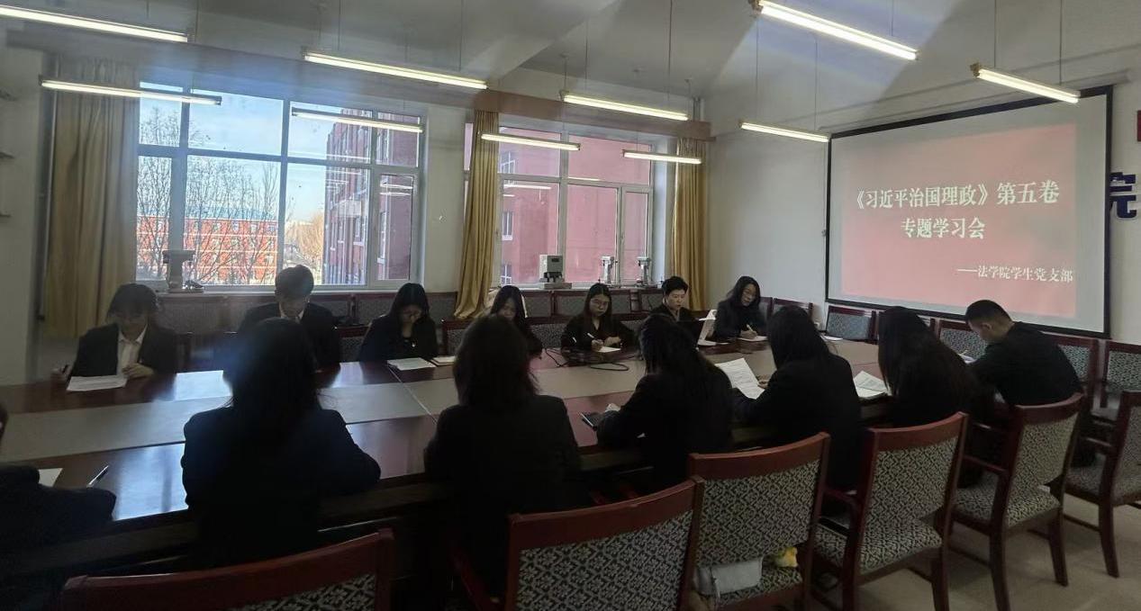 本次学习围绕《习近平谈治国理政》第五卷第七章内容,聚焦“建设更高水平的法治中国”专题,通过集中研读和交流讨论,与会党员深入领会了新时代推进全面依法治国的重要论述和战略部署。会议指出,该章内容为准确把握中国特色社会主义法治体系的根本方向与实践要求提供了重要遵循,也为党员学子深化专业认知、坚定法治信仰筑牢了思想根基。